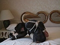 スーツに黒いパンスの秘書を緊縛して、ベッドに放置…。